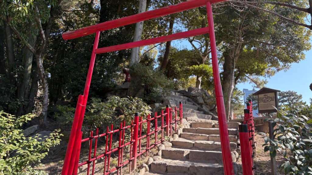 Particularly striking is the red torii gate standing quietly amidst the greenery. Its vivid red stands out against the soft hues of the foliage, captivating visitors and prompting many to instinctively raise their cameras to capture its beauty.